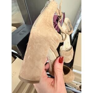 Slim straps cross at the ankle of a scene-stealing block-heel pump in a classic round-toe silhouette.