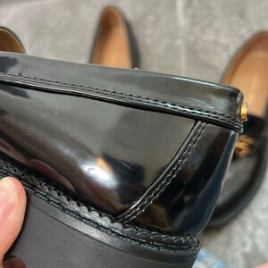 Step out in style with these sleek black patent loafers. Featuring a chic gold accent, these shoes offer both elegance and comfort for any occasion.