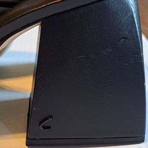 Great condition, but there are a couple of dents on the block heels. See pics for details.
