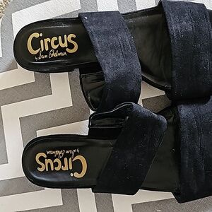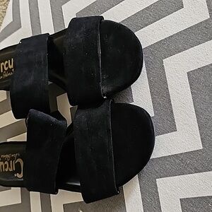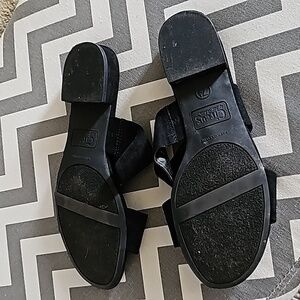 Black. The straps have a suede lile feel. Small feel so not completely flat. Good condition.