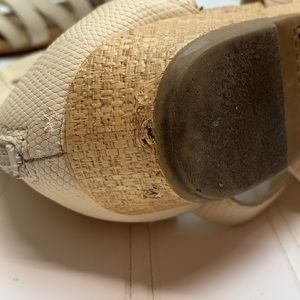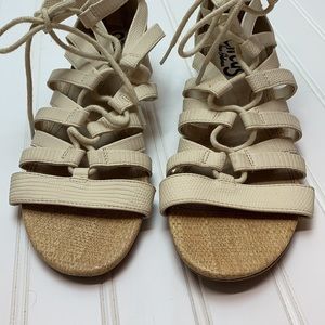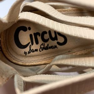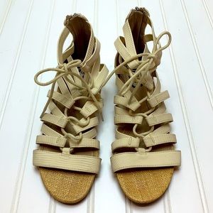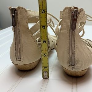 Sam Edelman Circus ivory gladiator sandal I think this sandal is an 8.5 but not sure so please see the pictured measurements. I put it next to a Steve Madden 8.5 for reference. Good used condition with some scuffs on the back of the heels, pictured.