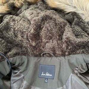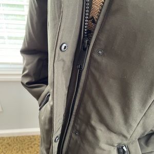 Olive green, winter, water repellant coat with removable hoodie and 2 pockets. Very warm!