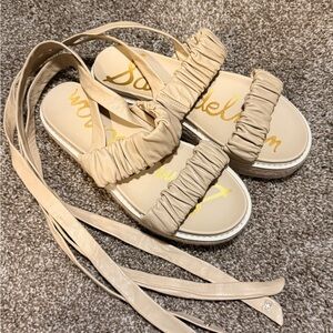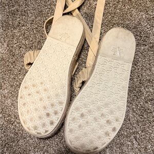 Elegant cream sandals with ruched straps. Comfortable and stylish for any outing.