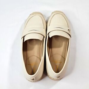 These Sam Edelman flats feature a cream canvas upper with a classic penny loafer design, complemented by a moccasin-style toe and decorative strap. The espadrille-inspired sole, crafted from braided jute, adds a touch of casual elegance, making them perfect for warm-weather outings.