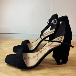 Sam Edelman Daniella, a block heel sandal designed with a wide strap, ankle closure and thick, solid heel.