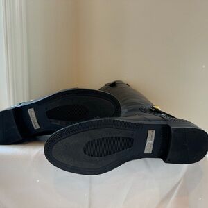 Like new, worn once and stored in original box. Beautiful asymmetric shaft with embellished ear pull and embossed button. 100% leather with rubber sole. 18 inches to top of back zipper and 19 to top of ear pull.