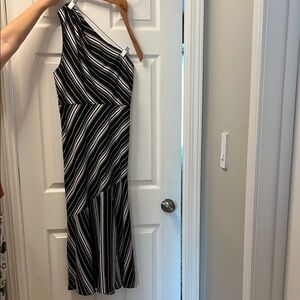 Sam Edelman One Shoulder Black / White Striped Midi Dress Size 10, one shoulder neckline, sleeveless, side zip closure, Lined, Slit,