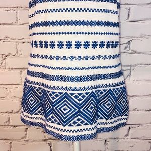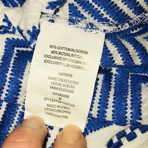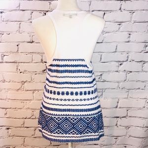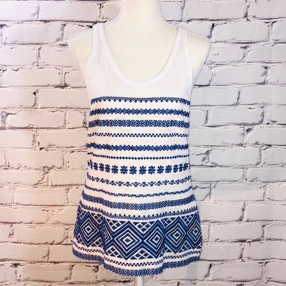 Worn once! Excellent condition, like new! Pretty white Racerback tank top with blue embroidered pattern on lower half. 60% cotton, 40% Modal.