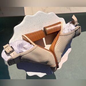 Sam Edelman women's open toe bootie. Size 8. Grayish Beige and brown. Ankle strap with buckle closure. Block heel. Good condition. Please see all the pictures. The lining from strap is peeling. Some of the original glue mark on the insole. Nothing major. the Sole and the leather are in very good condition