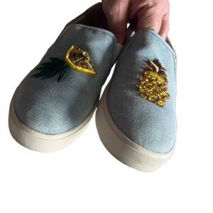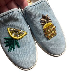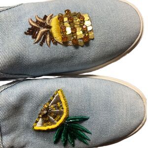Stylish denim slip-on shoes. Features pineapple and lemon beaded embroidery. Casual slip on sneaker walking shoe style
