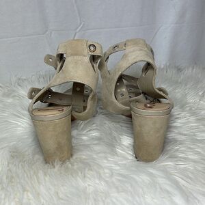 Heel height is 3.5". In very good pre-owned condition. Normal wear and tear noted, but no flaws or damage. Please review pictures and feel free to ask any questions or for more pictures prior to purchasing.