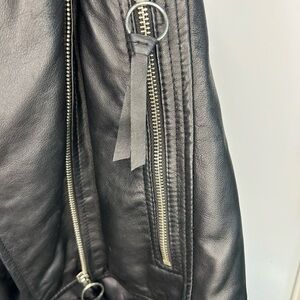 ✨ Details: Classic biker moto cut, zip front closure, zippered cuffs, adjustable waist tabs, silver hardware details, fully lined.