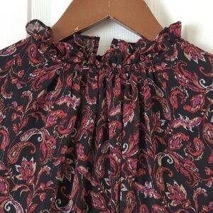 The beautiful dress features a sleeveless silhouette and a high neckline with a ruffled trim, a blouson bodice with an elastic waistband, and a keyhole and button closure at the back. It is fully lined with an a-line cut that allows it to be flowy, loose and relaxed throughout the tiered midi length skirt. It is black in color with an all-over floral paisley print that's red, pink, peach, beige and white. Lightweight and breathable with a breezy silhouette that is perfect for Spring and Summer. Classic, sophisticated, elegant and chic! Very high quality!