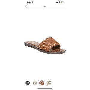 stylish Sam Edelman slip-on sandals featuring a rich brown woven leather upper adorned with gold stud detailing. They are perfect for warm weather, offering a chic look with their comfortable slide silhouette and distinct textured sole.