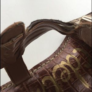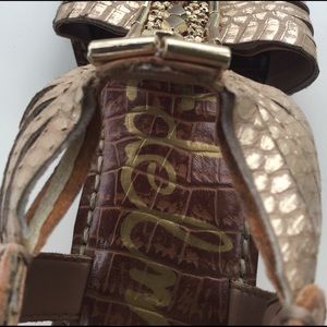 Beautiful Sam Edelman gladiator style sandals. Tawny and gold. Textured straps with gold embellished foot. Zips up the back. Leather footbed. Size 5. Tags: boho hippy glam bohemian wedding beach Gypsy spell