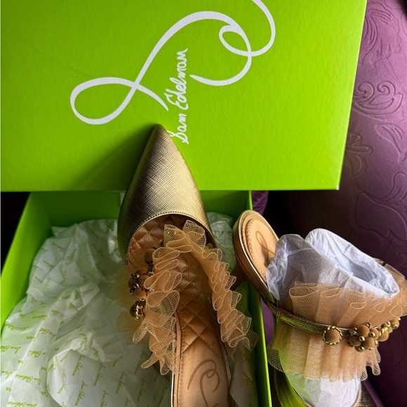 Chic gold heels with elegant ruffle accents. Perfect for a stylish look.