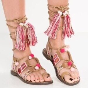 Fringe tassels and pom pom charms add unforgettable details to these beauties. Embroidered upper.