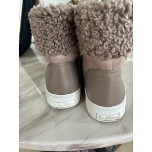 Very good pre-owned condition, there is just one mark on the suede and some discoloration to white sole. Grey suede, lace up front. High top. Grey faux shearling around the high top. Winter sneaker.