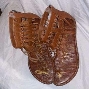 Sam Edelman Griffen Gladiator Fringe Leather Boho Thong Sandals size 9 Brown. Good preowned condition. Zipper in backs. Few scratches noted. See pictures. Minor wear to sole and insole. Two tier fringe. Bohemian. Western.