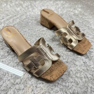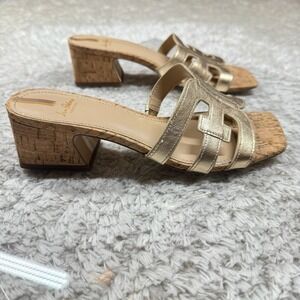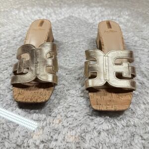 Keywords: Sam Edelman, Gold sandals, Block heel, Square toe, Mules, Leather sandals, Women's shoes, Size 7, Cork heel, Metallic sandals, Designer sandals, Slip on sandals