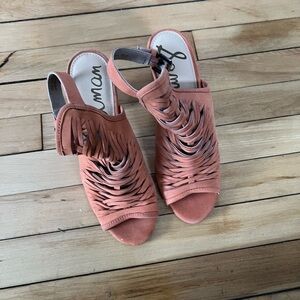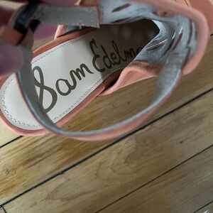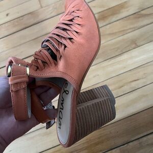 Sam Edelman Holly Heels Interwoven Straps Open Toe 3" Stacked Heel in coral size 9. GUC.