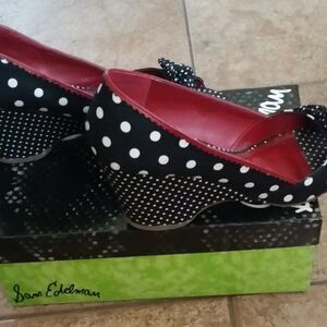 Sam Edelman INDIGO black/white polka dot canvas peep-toe wedges