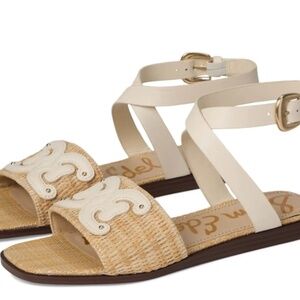 Experience the perfect blend of style and comfort with Sam Edelman's white and tan sandals. These minimalist sandals feature a sleek open-toe design and a comfortable flat sole, making them ideal for any occasion.