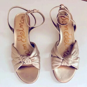 Glimmering sandal with a delicate ankle strap and knotted straps at the vamp.