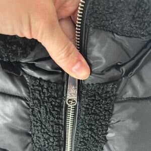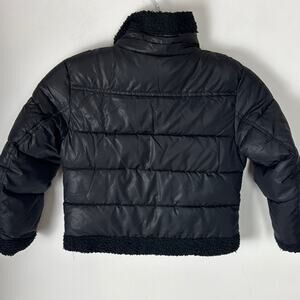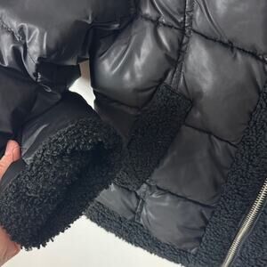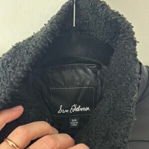 Gently Used Sam Edelman Full Zip Puffer Jacket. This is a girls 5/6. Black throughout. Mostly a puffer but there are fleece accents around the zipper, pockets, and waistband. 100% polyester.