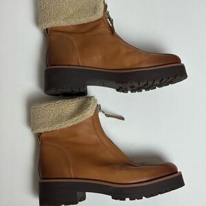Warm chestnut colored leather boots with faux shearling cuff. Functioning vamp zipper closure. Lug sole - approximately heel height 1.5”. Some minor scratches and discoloration on interior of the shearling. Very good used condition. May not fit wide feet comfortably.