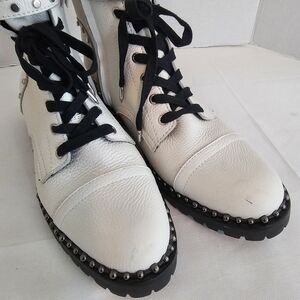 Stylish white combat boots. Features studded details and dual buckle straps. Durable black sole.