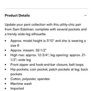 Sam Edelman Jildie High Rise Utility Chic Black Wide Leg Pants - NWT - Size 12