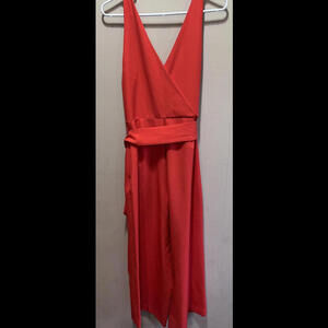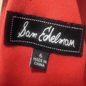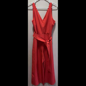 This is a Sam Edelman jumpsuit in coral, with a V-neckline, sleeveless style, tie waist closure, and wide-leg crop design. It is a one-piece made of a polyester blend material, size 6, suitable for various occasions like travel, weddings, parties, and workwear.