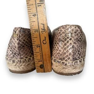 NWOT Adorable leather jute wrapped Espadrille slip on flat from Sam Edelman Kesia with round toe, lightly cushioned footbed silver tone logo at heel counter in a snakeskin look. New, without tags or box.
