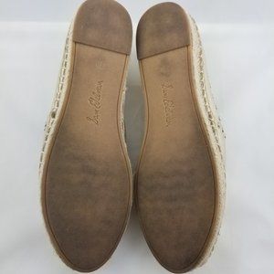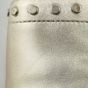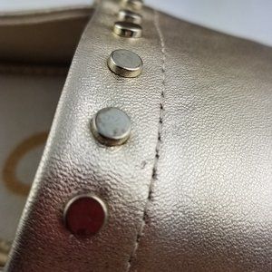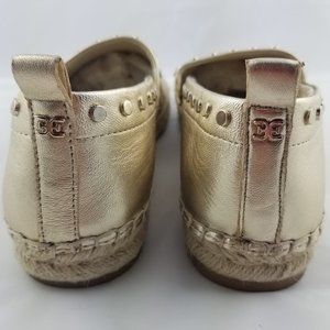 Molten gold metallic leather with gold toned stud detail trim. Rubber sole with espadrille midsole (3/4" platform). Round toe. Back pull-tab. Slip-on style. Padded insole for extra comfort. Great pre-owned condition! The studs are a little scuffed from wear. Minor scuffs on leather - because of the gold, imperfections blend well. See photos.