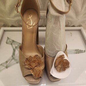 Sam Edelman "Kori Flora" Platform Sandals. NIB. Size 8.5. NIB/Original box/packaging with card. Must be a return, I see scant dirt markings on the bottoms. No rips/stains/scuffs/tears/peeling or wear. Box has very minor damage. Smoke free home. No odors. All offers are welcome. Color is called "Blush", but to me they are a light tan/brown with a gold shimmer. In the light you may see just a touch of pale pink tones. Smoke free home. no odors. All offers are welcome. Thank you!