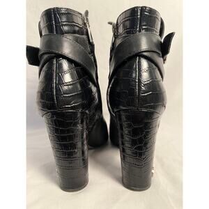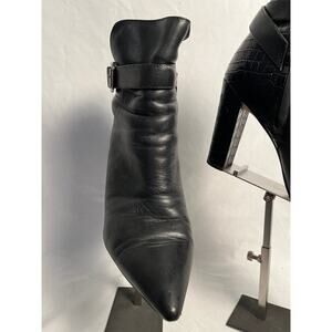 Sam Edelman women’s leather ankle boots in black, size 9 medium. Sleek pointed toe ankle boot design with a high block heel and side zip closure for easy wear. Smooth leather upper with croc embossed leather detail on the heel and ankle strap with buckle accent for added style. Well made statement boots with a modern polished look that works well for dressy outfits or elevated everyday wear. Pre owned condition with normal wear consistent with use including light creasing from wear. No major structural flaws noted. Please review photos carefully before purchasing. No returns for fit or sizing. Buyer pays return shipping if a return is approved.