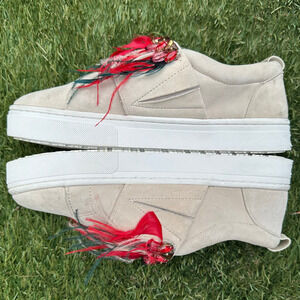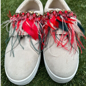 With its fun and colorful feather embellishments, these unique sneakers have a bohemian native western vibe. The shoes have slight platform, and provide a chic vibe that we all are craving for a festival season and the upcoming. Eclectic, Rare Statement shoe. Comfortable for all day wear, no heel with a flat sole.