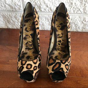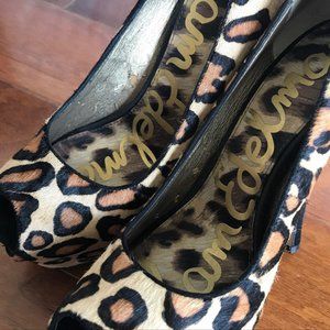 SAM EDELMAN LEOPARD PRINT PEEP TOE STILETTO HEEL SIZE 7. Leopard print with black suede heel and leather patch at upper heel of shoe, platform 2 ". Beautiful animal fur like.