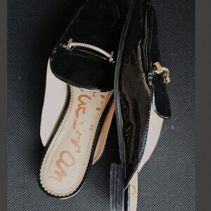 A glittery scalloped insole trim adds dainty style to this sleek mule that has brassy goldtone hardware and a subtle heel.