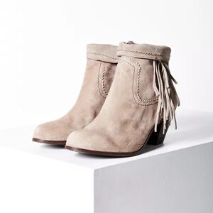 These Sam Edelman ankle boots in tan offer a chic and versatile style with their sleek silhouette and bohemian-inspired fringe tassels. The low stacked heel and rounded toe provide comfort, while the side zipper ensures easy wear.