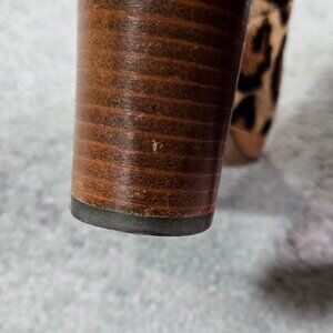Good used condition. Calf hair pumps, with a leopard print. Has a round toe, chunky heels, and adjustable ankle straps. Has wear on the inside, and minor wear at the bottom of the heels.
