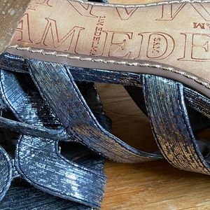 Metallic grey sandals with 2.75" wooden heel. Great condition, tiny bit of wear at center of left shoe (see photo).