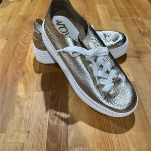 Shiny metallic sneakers with white laces. Elevate your casual look.