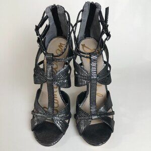 Sam Edelman Gunmetal Metallic Leather Strappy Stiletto Sandals. 4.5 Inch Silver heel. Textured pattern looks similar to croc print. Zips up the back. Very minimal wear! Size 7.5