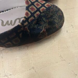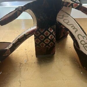 Chic velvet heels with a multicolor pattern. Features a block heel and ankle strap. Perfect for stylish outings.