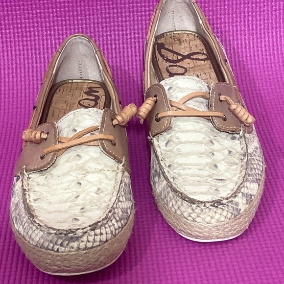 Sam Edelman NWOT Women's Snake-print Leather Boat Shoes. Color: Beige/Grey/Tan Snake-print. Like new (never worn) leather slip on shoes. Cork Insoles. No Box.