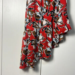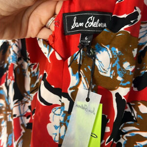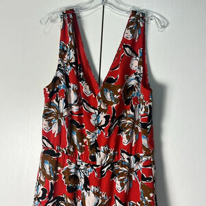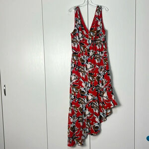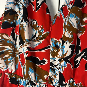 Sleeveless v neck, red dress with black blue brown and white floral pattern.