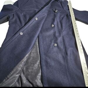 Sam Edelman coat is an XL size, navy blue A-Line pea coat made from a wool blend. It features a big collar with metal clip closure, making it both stylish and functional. The coat is lined, breathable, and thermal, providing warmth and comfort. Additionally, it has pockets and is packable, making it convenient for on-the-go use. Perfect for adding a cozy and chic touch to any outfit, this coat is a versatile and stylish option for women's outerwear.