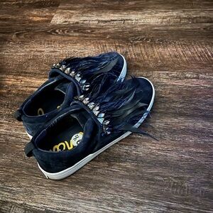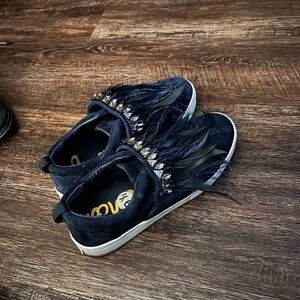 Stylish navy sneakers with feather details. Add flair to your casual wear.